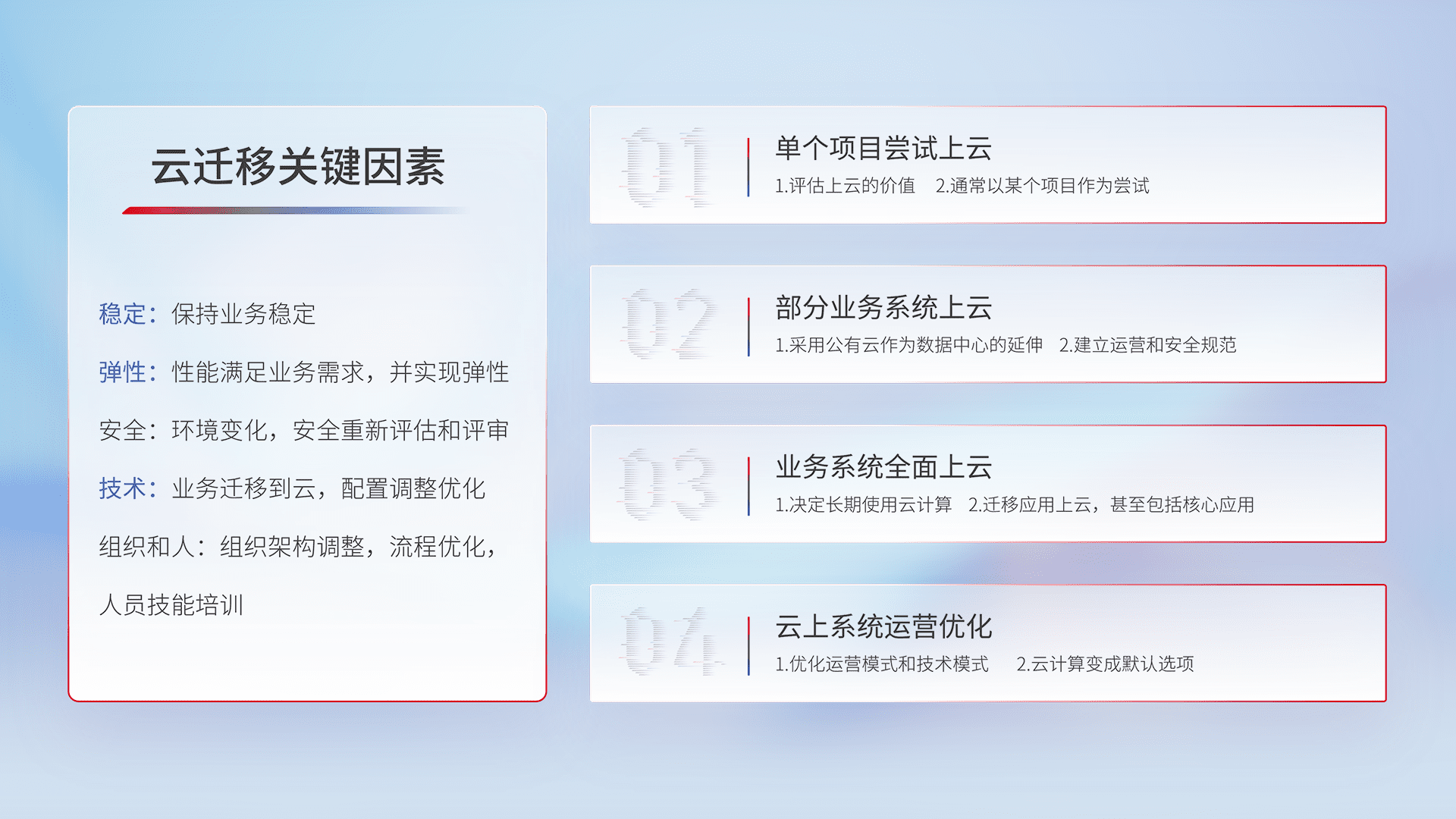结合实际业务,,,从规划设计、、、云平台选型、、、、云原生改造、、、、数据迁移、、、、集成交付,,,迁移全过程为客户识别最佳上云路径,,做好风险识别管理,,,,设计网络架构、、、身份权限、、、安全审计合规、、、操作审计、、、日志审计、、、、监控告警策略、、、、多站点容灾设计等,,对云上基础设施进行整体规划,,,,提升IT治理水平,,以满足弹性、、、高可用、、、高性能的需求。。。