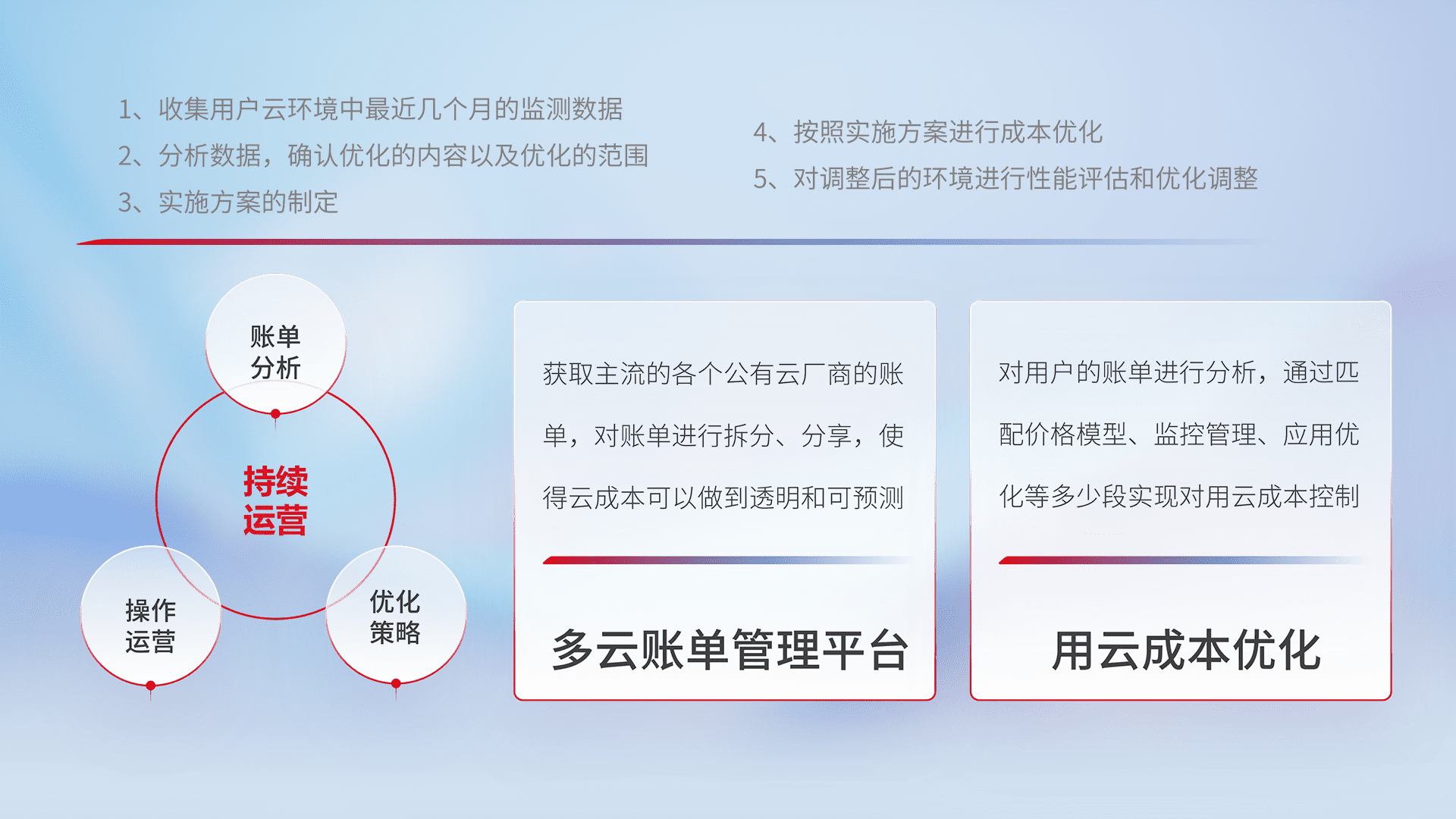 通过多云纳管,,,以统一的资源数据模型把客户的云资源进行抽象和封装,,进而实现对多云资源的统一操作,,,,保障云资源管理的可靠性、、、、稳定性与可用性。。量身定制化运维内容,,,,配置、、、、开发运维、、补丁管理、、、备份、、、、监控、、认证和访问管理、、、审计和日常巡检等,,保障在用云过程中的可靠度,,稳定度以及高可用率。。。