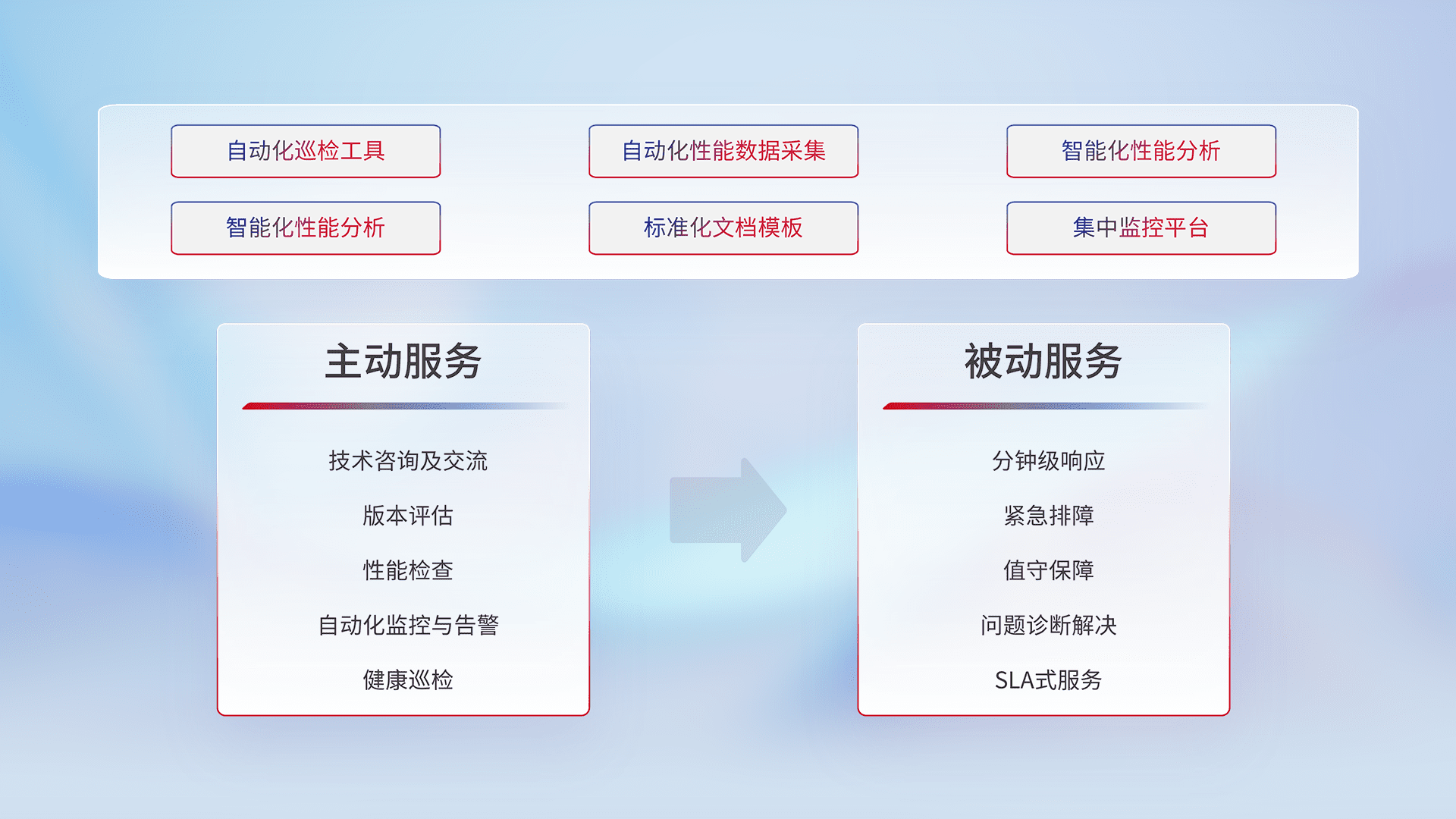 智能化工具和标准化文档,,保障服务质量,,,,提供主动服务(包含技术咨询、、、、版本评估、、、、性能检查、、、、自动化监控与告警、、、、健康巡检)和被动服务包含(分钟级响应、、、、紧急排障、、、值守保障、、、问题诊断解决、、SLA服务)。。